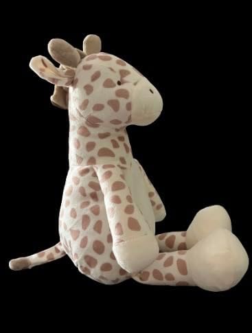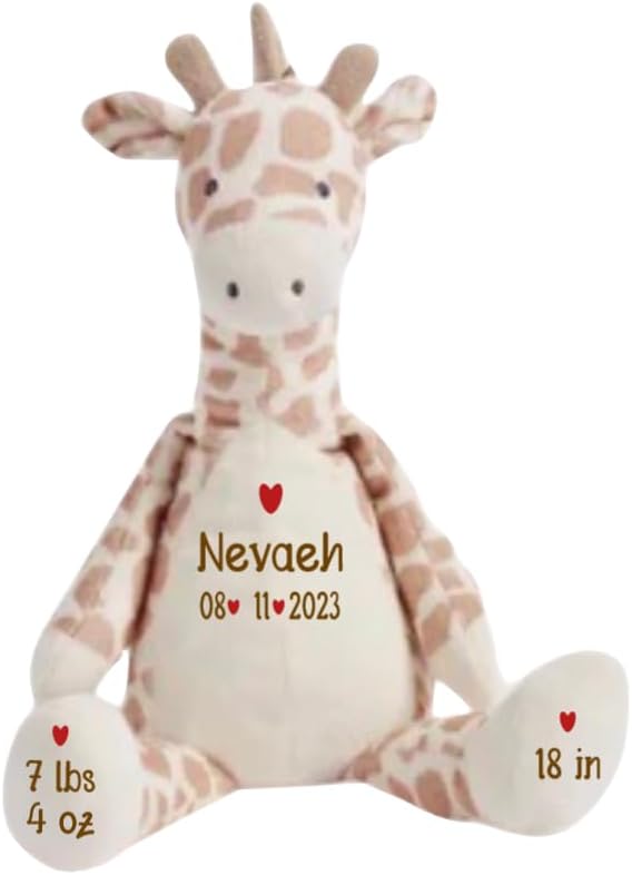 This plush Giraffe comes customized with your child's name and birth date on the chest! weight on one foor and length on the other. Too Cute!. Makes a beautiful addition to any new baby's nursery and can be the perfect photo prop for monthly baby pictures!