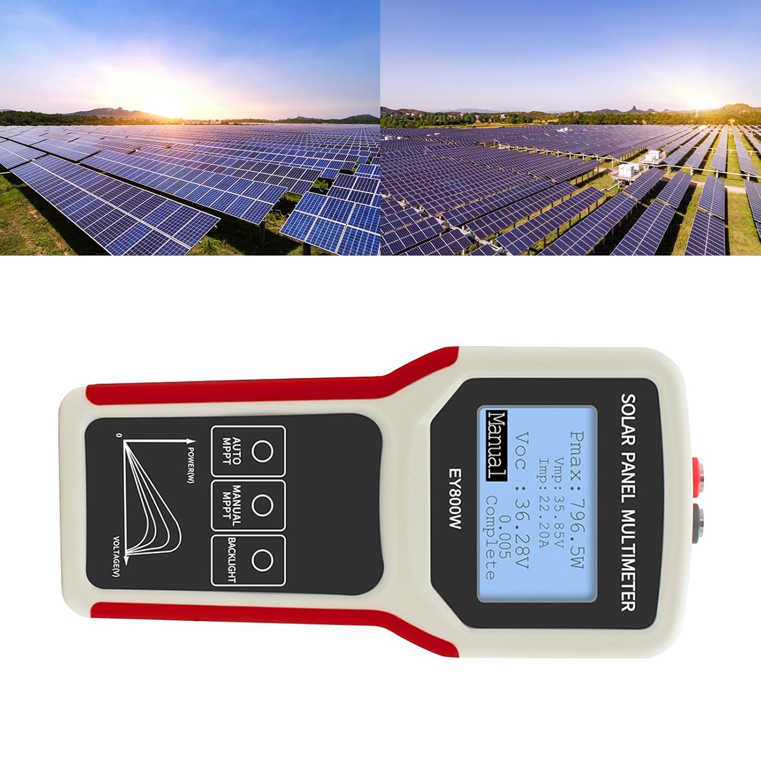 LCD Display Solar Panel Multimeter 800W Photovoltaic Tester Voltage Current UtilityTool For Solar PVTesting MPPT ToolsFeatures:Maximize Your Solar Panel Efficiency with Solar Panel Multimeter The UltimateSolution for Testing MPPT and Measuring Power Output.With its Automatic and Manual MPPT Detection, Overvoltage, Overtemperature, and OvercurrentProtection, and no External Power SourceRequired, EL800w Solar Panel Multimeter is the Most Versatileand Tool for Solar Energy Professionals and Enthusiasts Alike.Whether you are a Solar Panel Installer, Maintenance Technician, or Enthusiasts, Solar Panel Multimeter is the for You to OptimizeYour Solar PanelPerformance and MaximumPower Output.Use Solar Panel Multimeter to Your Solar Panel's MPPT and Measure Its Power Output inRealTime. For Field and Lab Testing, Troubleshooting, and QualityControl.With Its Compact Size, Lightweight, and Robust EVA Tool, EL800w Solar Panel Multimeter is Easy to Carry and Store, Making It an Essential Tool for Any Solar Energy Professional or Enthusiasts.Specifications:Power 0.1W-800WVoltage: 12-60VCurrent: 0-20APower supply: Solar panel power supplySize: Approx. 16.5x8x3cm/6.5x3.15x1.18inPackage Includes:Solar Panel Tester x1MC4Cable x1CrocodileClip Wire x1EVA Tools x1User Manual x1Note:1.AUTO MPPT check2. Manual MPPT detection3. Over voltage, over temperature, over currentprotection4. Overrated powerprotection5. No additional power requiredWhen the AUTO MPPT button is pressed, the instrument will automatically adjust the interval according to the current power value and refreshthe digital display.For example, when the solar panel power is 100W, refreshit every 5S. When power is 300W, refreshit every 15S.When the manual MPPT button is pressed,