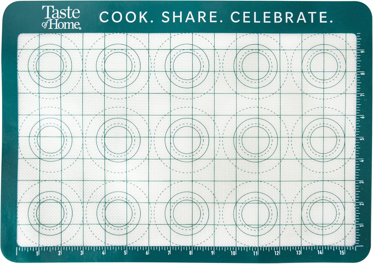 The Taste of Home Bakers Bundle features four premium items designed to provide an effortless baking experience! Baking your family's favorites has never been easier; use the Taste of Home Non-Stick Metal Baking Sheet and Non-Stick Metal Cooling Rack to bake and cool everything from savory sheet pan dinners to sweet baked goods. The 18 x 13-Inch Baking Sheet features an embossed geometric design that strengthens the baking sheet while increasing the airflow to food, creating evenly distributed heat for consistent baking every time, and a premium non-stick coating releases foods easily. The Taste of Home Non-Stick Metal Cooling Rack is crafted from premium non-stick coated carbon steel and fits perfectly in the included Baking Sheet. Raised feet allow airflow to circulate underneath baked goods, and a narrow wire grid ensures small items don't slip through. Finally, place the Silicone Baking Mat on top of your baking sheet instead of greasing your baking sheet! Featuring printed cookie and macaron markings, which guide you to space your treats evenly, this durable, non-stick food-grade silicone mat helps you achieve optimal baking results! In addition, you can pop this baking mat in the freezer, transfer it to the oven or use it on the counter as you prep and bake! After you've baked, cool your crowd-pleasing treats on the Taste of Home Non-Stick Metal Cooling Rack, crafted from premium non-stick coated carbon steel! The superior non-stick coating ensures baked goods release effortlessly, and the raised feet on the cooling rack promote air circulation for even and fast cooling.